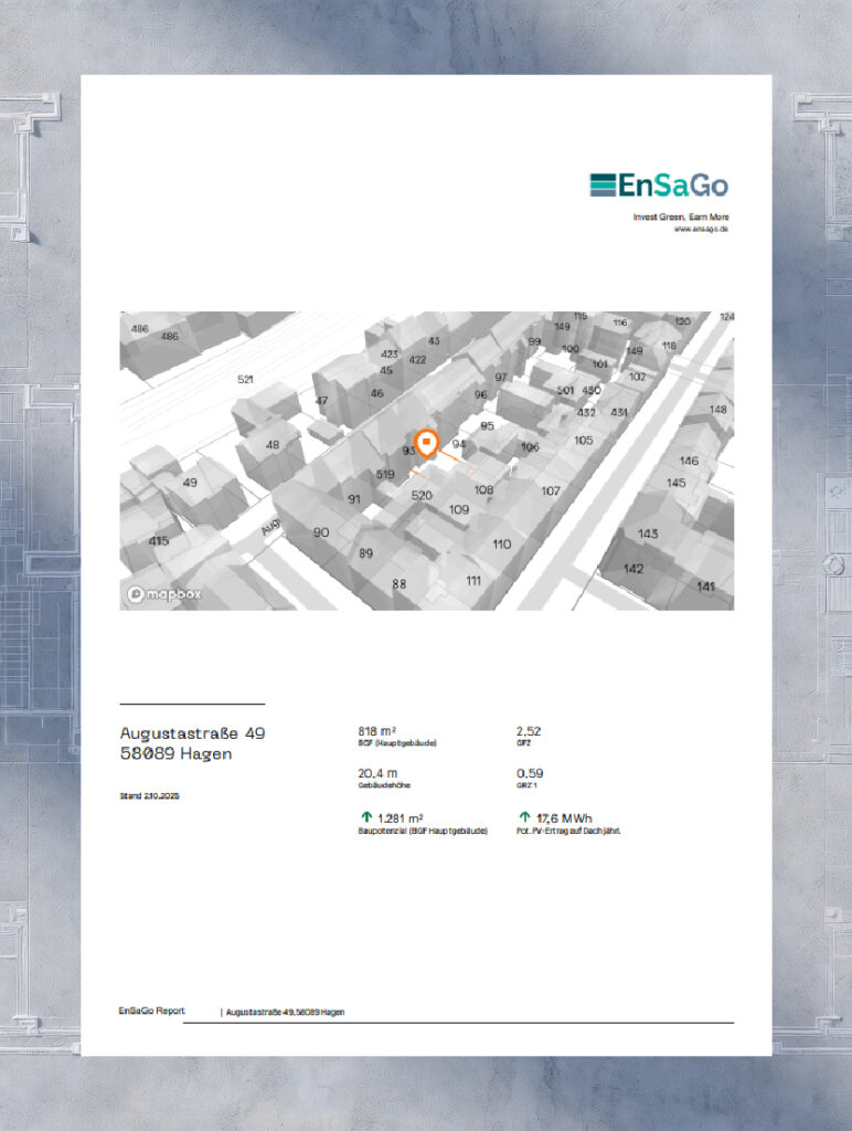 The future of real estate lies in energy efficiency and sustainability. At EnSaGo, we transform complex renovation projects into profitable investments. Our AI-driven platform automates building analysis, financing strategies, and subsidy applications—ensuring maximum funding with minimal effort. Whether you’re a property owner, investor, or developer, EnSaGo provides a streamlined, data-driven approach to energy-efficient renovations, turning costs into long-term financial gains.